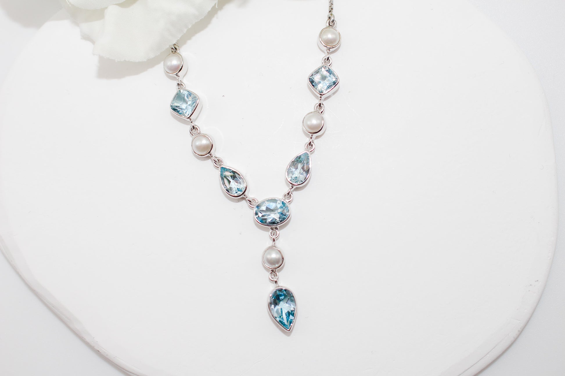 Upgrade your jewelry collection with our master set of Blue Topaz and Pearl Jewelry. The natural, brilliant blue topaz pairs perfectly with the lustrous freshwater pearls, making it the perfect set for any evening out or special occasion. Also makes for a thoughtful and elegant gift.