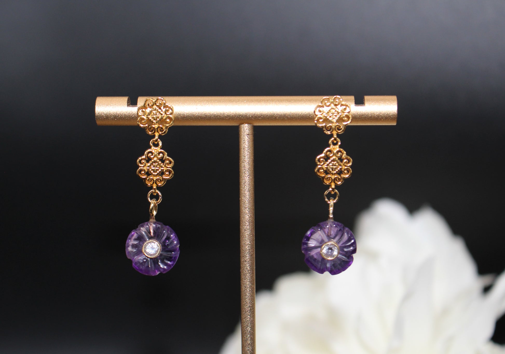 This pair of amethyst earrings brings an elegant touch, showcasing a deep, radiant purple that elevates both day and evening styles.